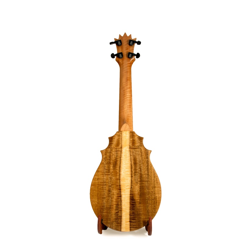 The lazer etched pineapple headstock and unique design make this a highly popular and unique ukulele! With the unique concert body pineapple design, this beautiful sounding ukulele is a great looking and playing piece. With the select cuts of acacia, the ebony stripe side detailing, and beautiful maple inlay, this ukulele will be sure to turn heads!